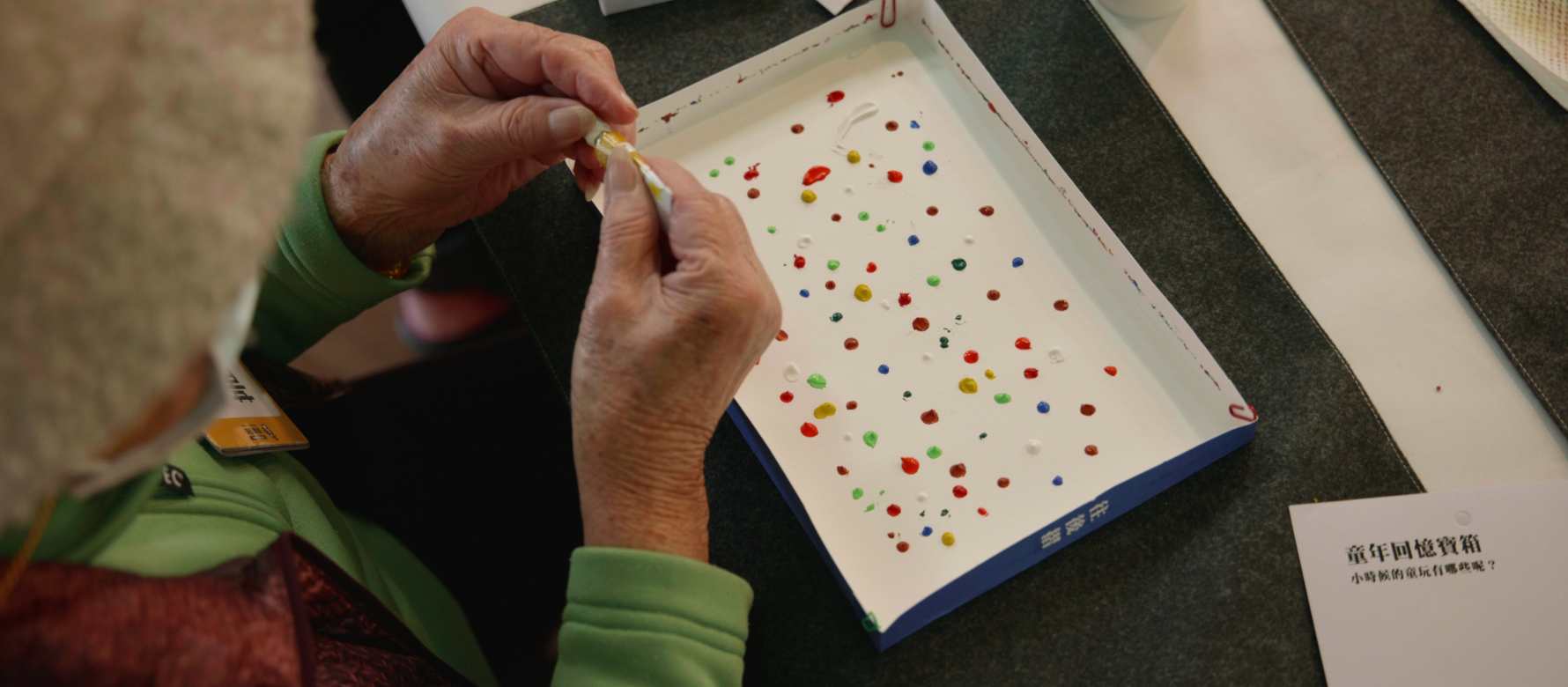猶記得孩堤時代,總喜歡跟弟弟拿著布娃娃扮家家,利用毛巾、棉被堆出城堡,帶著每一隻有專屬它們姓名的布娃娃們,在城堡中穿梭嬉戲。這是屬於我的童年,是粉橘色的,就是我最愛的小狗娃娃的顏色。 每一個時代有不同的童年回憶,你的童年會是什麼顏色的呢? 這也是「特調爺奶」團隊在每一次課程當中對長輩們拋出來的問題。